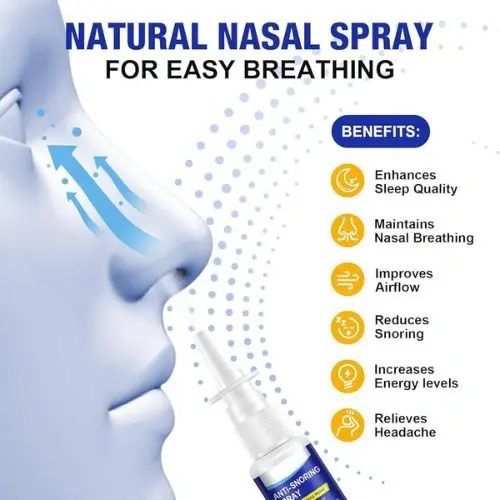 Get instant relief from snoring and nasal congestion with our Anti-Snoring Nasal Spray. Opens airways for smooth breathing and better sleep quality.