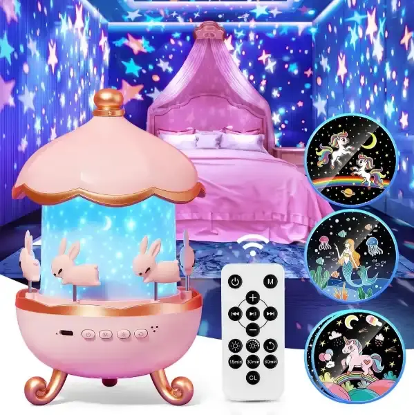 Adorable Bunny Carousel Design – A cute and playful night light that adds charm to any kid’s bedroom or nursery.